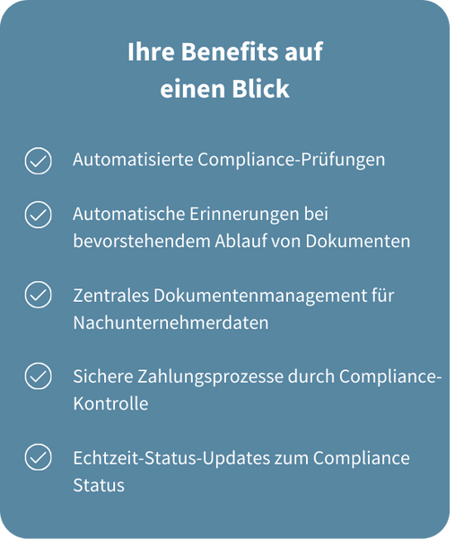 Bleiben Sie mit Ihren Unterlagen mühelos auf dem Laufenden. Verfolgen Sie die Gültigkeit von Bescheinigungen und erhalten Sie rechtzeitig Benachrichtigungen vor dem Ablauf. Konsolidieren Sie alle Nachunternehmerdaten und -dokumente in einem einzigen, zugänglichen System.